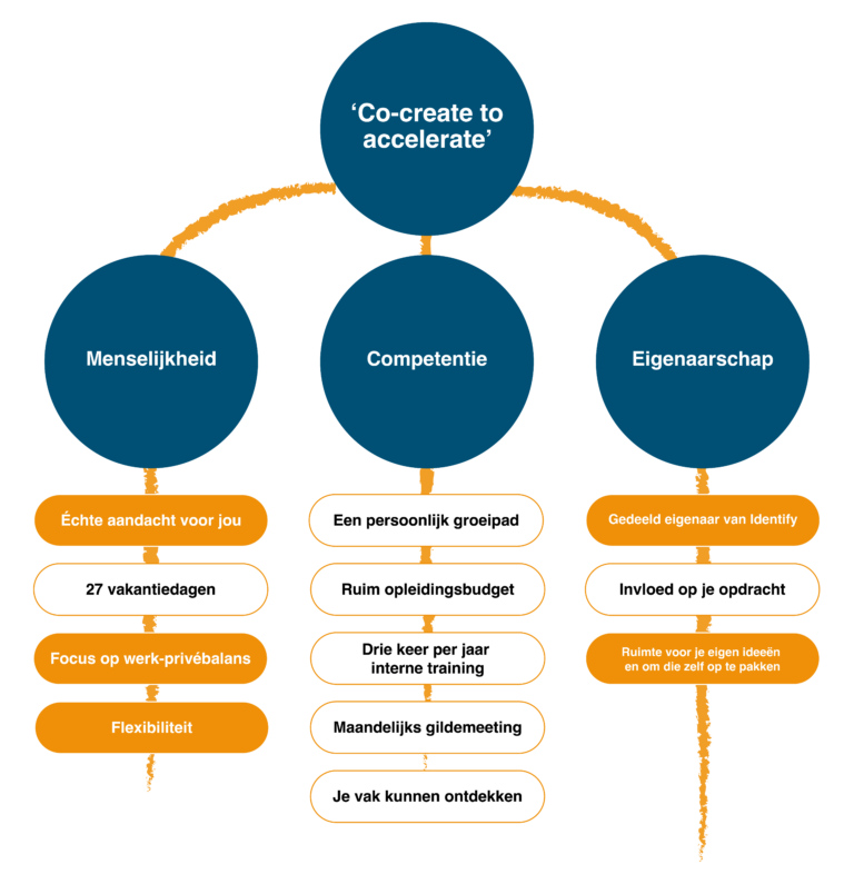 Hieronder staat een opsomming van onze belangrijkste arbeidsvoorwaarde bij Identify. De uitgelichte elementen zijn voor ons absoluut bijzondere elementen waarmee we onszelf willen onderscheiden.